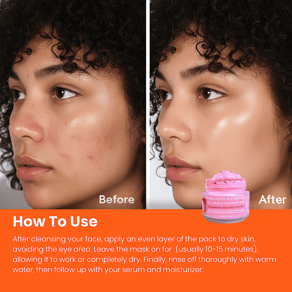 Our Pomegranate & Peptide Mask is a high-performance ritual designed to tighten, brighten, and restore. We’ve blended the world’s most effective botanical actives—Bakuchiol and Resveratrol—into a creamy 100g treatment that works while you relax.